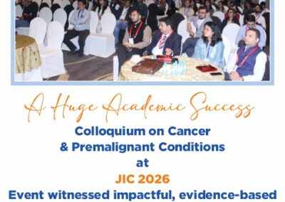 As an integral academic component of JIC 2026, the colloquium focused on the growing burden of oral cancer in India, emphasizing the importance of early diagnosis of oral potentially malignant disorders (OPMDs) and timely clinical intervention. The sessions highlighted the critical role of dentists and oral healthcare professionals in identifying suspicious oral lesions, initiating diagnostic protocols, and contributing to comprehensive oral cancer treatment planning.