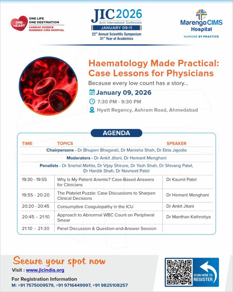 As part of JIC 2026 – the 22nd Annual Scientific Symposium and 31st Year of Academics, Marengo CIMS Hospital is organizing a focused academic session titled “Haematology Made Practical: Case Lessons for Physicians” on January 9, 2026, from 7:30 PM to 9:30 PM at Hyatt Regency, Ashram Road, Ahmedabad. The session is designed to translate complex hematological concepts into practical, case-based clinical learning, reinforcing the idea that every abnormal blood count carries an important diagnostic story.